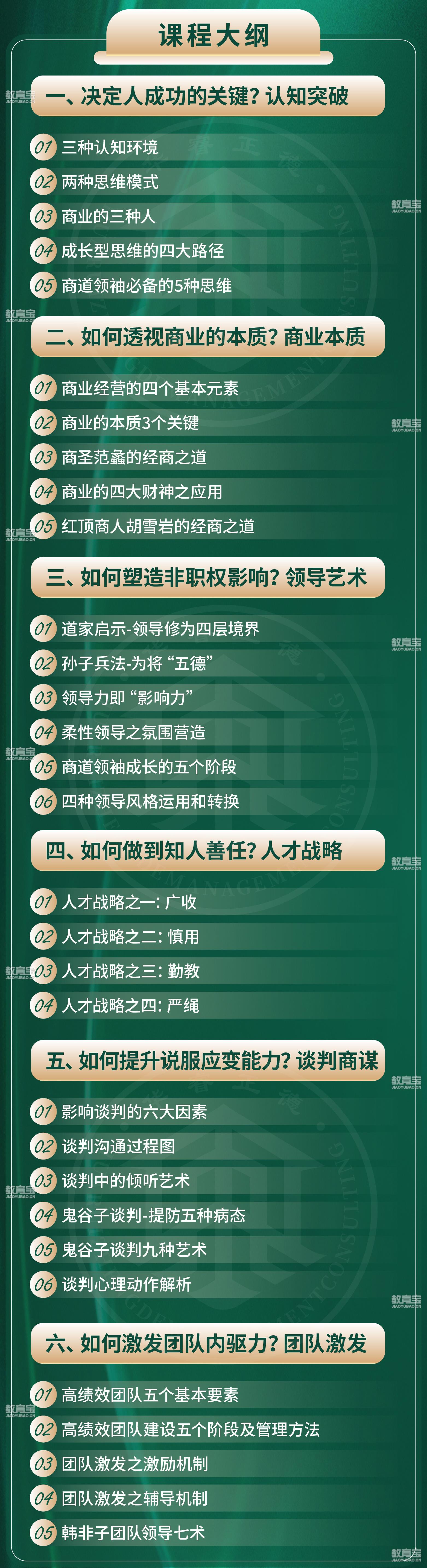 一、决定人成功的关键?认知突破 二、如何透视商业的本质?商业本质 三、如何塑造非职权影响?领导艺术 四、如何做到知人善任?人才战略 五、如何提升说服应变能力?谈判商谋 六、如何激发团队内驱力?